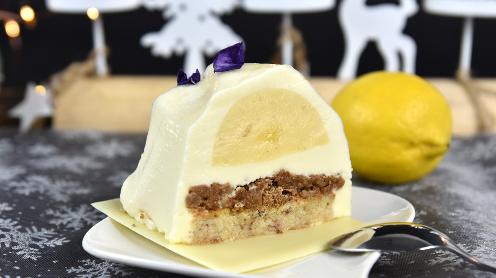 Biscuit amande, croustillant au praliné, crémeux Yuzu, mousse au citron et au Yuzu.