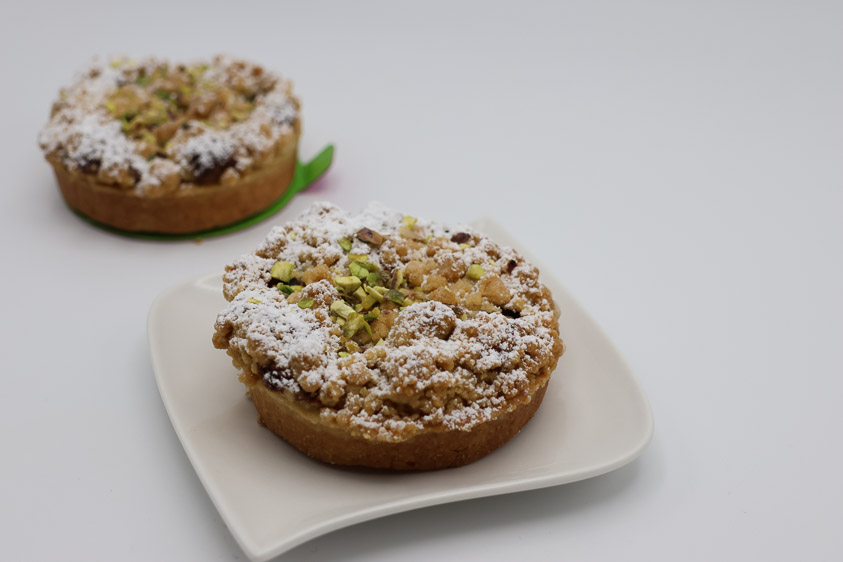 Pâte sucrée, crème d'amande, pistache, griottes, crumble.