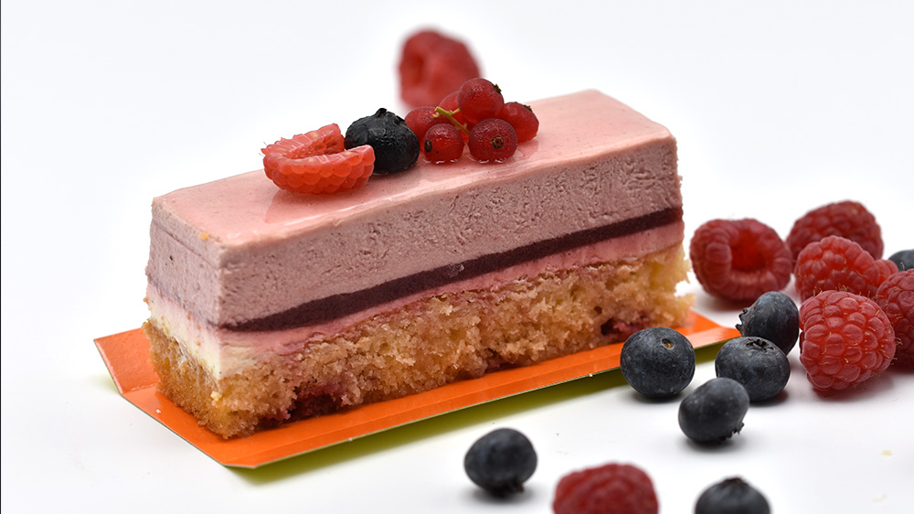 Biscuit madeleine, mousse vanille et fruits rouges, insert fruits rouges.