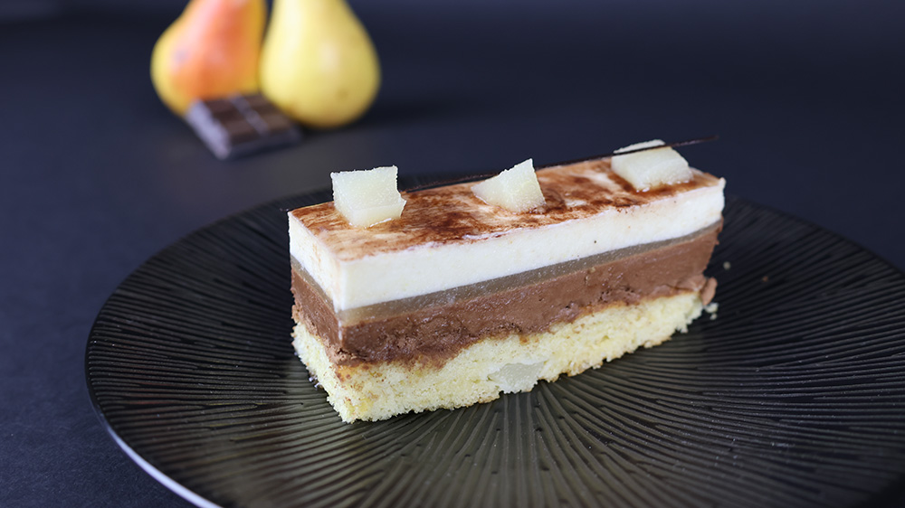 Biscuit madeleine, mousse au chocolat Valrhôna, insert et mousse à la poire.