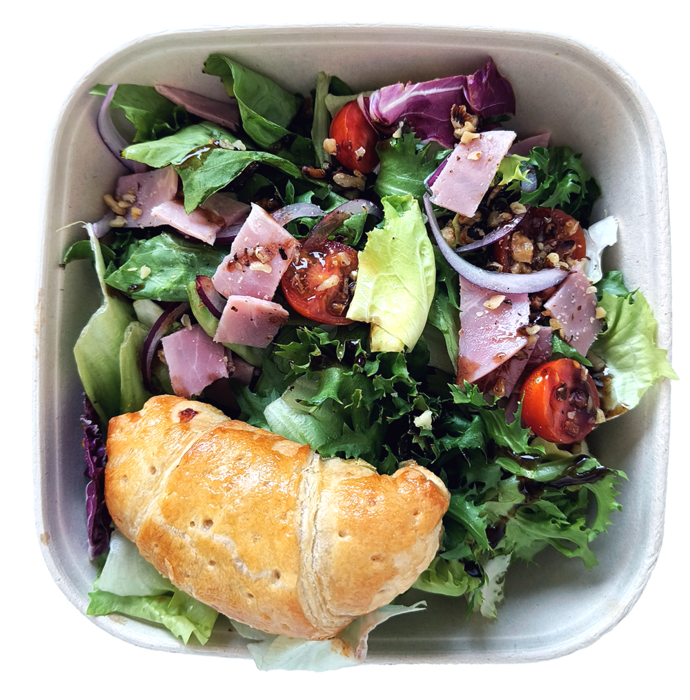 Salade, tomate cerise, feuilleté St Marcellin IGP entouré de lard fumé, oignon, jambon.