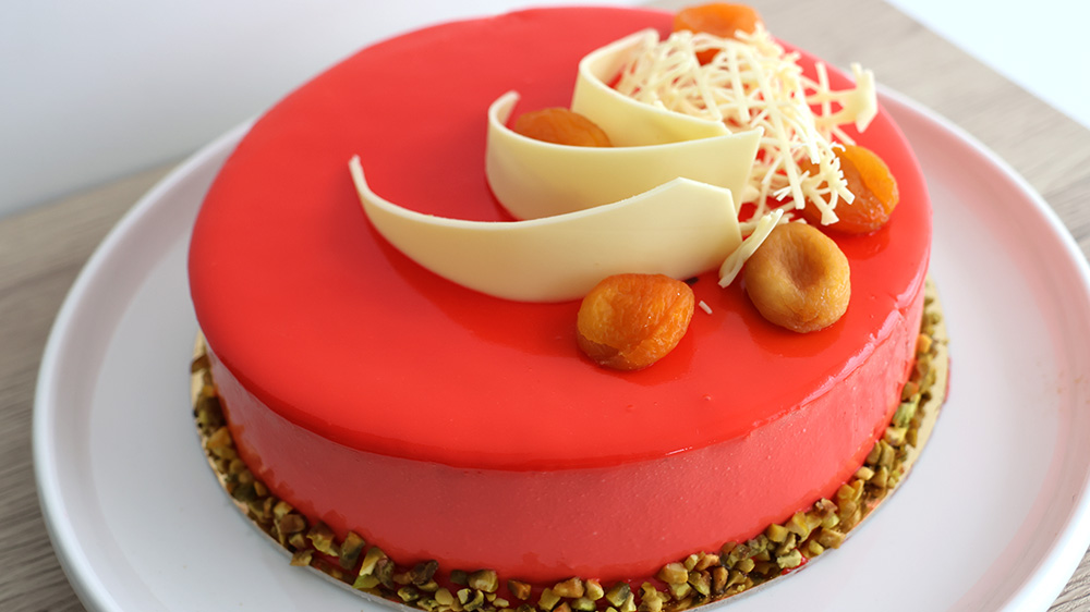 Dacquoise aux amandes, mousse fraise et huile d'olives, insert abricot. Décor pistaches.